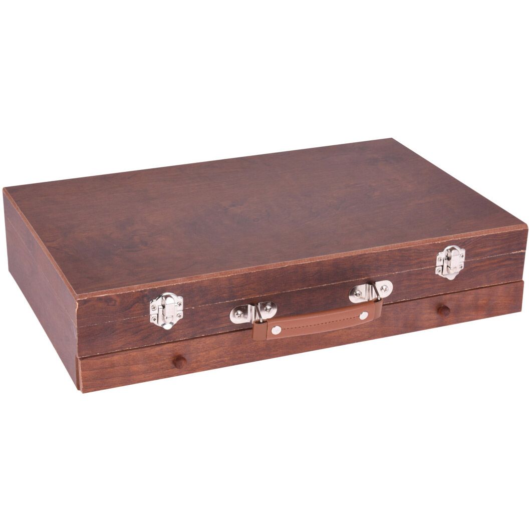 Deze houten koffer bevat 112 stuks aan teken- en schildermateriaal waar elke creatieveling enthousiast van wordt. Door de 2 sloten is de koffer goed vast te maken en met het handvat makkelijk te verplaatsen.